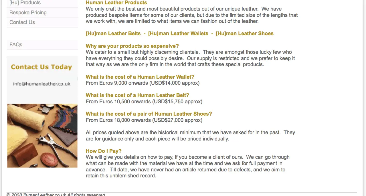 'Exqisite human leather' products, wallets, belts, shoes, being sold online