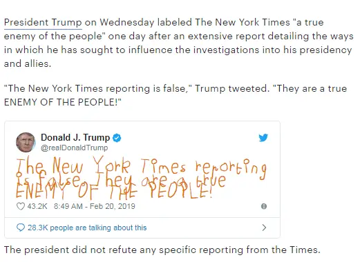 CIC Bone Spur Duce che' declares: A great paper the NEW YORK Times "A TRUE ENEMY OF THE PEOPLES"!
