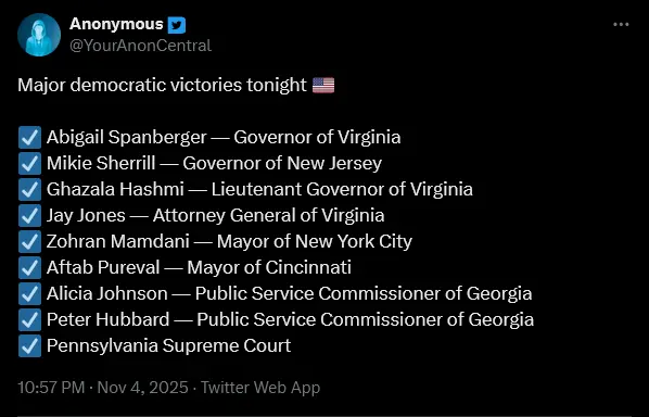 Democrats got all three tonight, with a clean sweep in off-year 2025 elections.