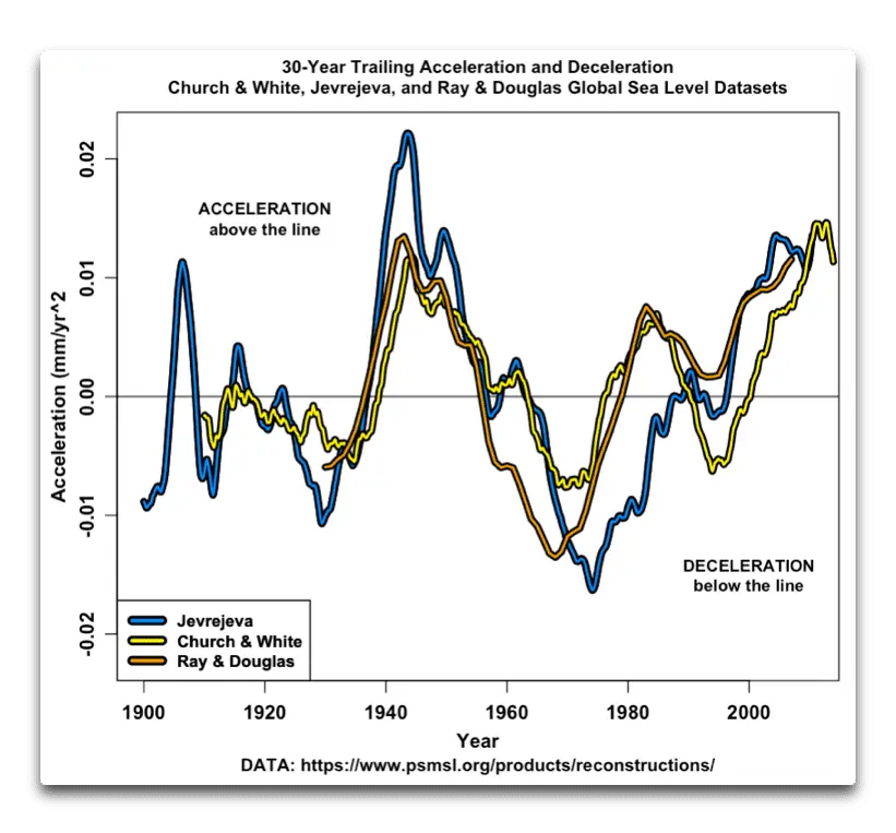Tide gauges show no acceleration in the rate of sea-level rise, merely the up-and-down that’s been going on for a century and more …