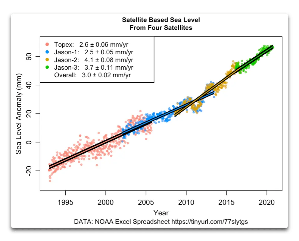Here's an improvement. Data from the University of Colorado Sea Level Research Lab.… and the claimed acceleration in satellite-measured sea level is merely an artifact of changing satellites.