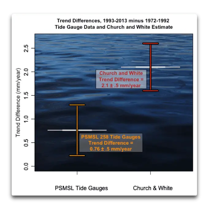 Figure 6. Comparison between the values and the errors of the difference between the 21-year trend before the 1993 start of the satellite record, and the succeeding 21-year trend from 1993 to the end of the Church and White records. The C&W trends are shown in Figure 3 above.