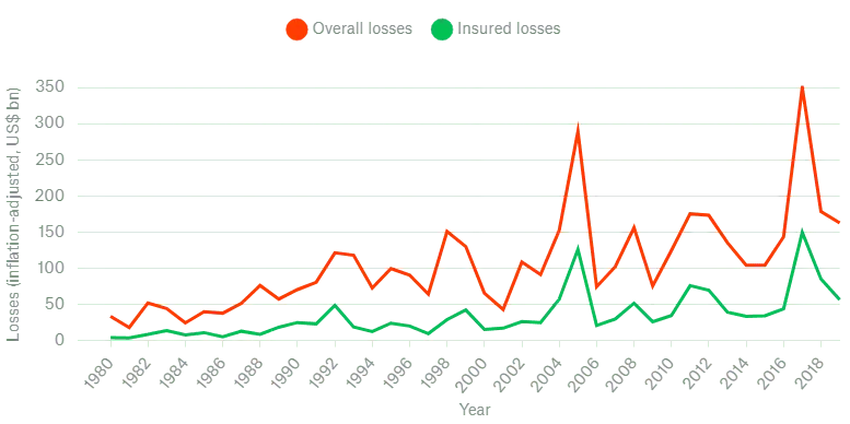 Less than one-third of global weather-catastrophe losses are covered by insurance. This underinsurance is most extreme in the poorer countries. For example, in Asia (excluding Japan) insured losses from weather catastrophes since 1980 are at less than 5% of the overall losses. But many natural hazards remain underinsured even in developed countries, as people, companies or even governments frequently do not have sufficient risk awareness. Take the example of the flood risk in North America: while nearly half of all weather-disaster losses there since 1980 have been insured, the figure for flood losses in the same period is just one-fifth