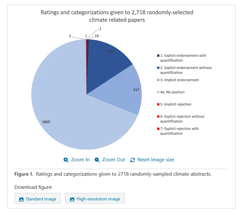 EDIT: to break down this image. This is 2718 that were randomly selected out of the 88,000+ dataset. of these 2718, most did not meet some kind of keyword to suggest they were either an endorsement of anthropogenic climate change or a rejection of that. This is because many studies do not necessarily say EXPLICITLY whether man made climate change is happening or not. Even if many of these studies imply it is happening, if it doesn't meet the keywords then it isn't included as an endorsement. But those that did say something distinctly, were overwhelming an endorsement.