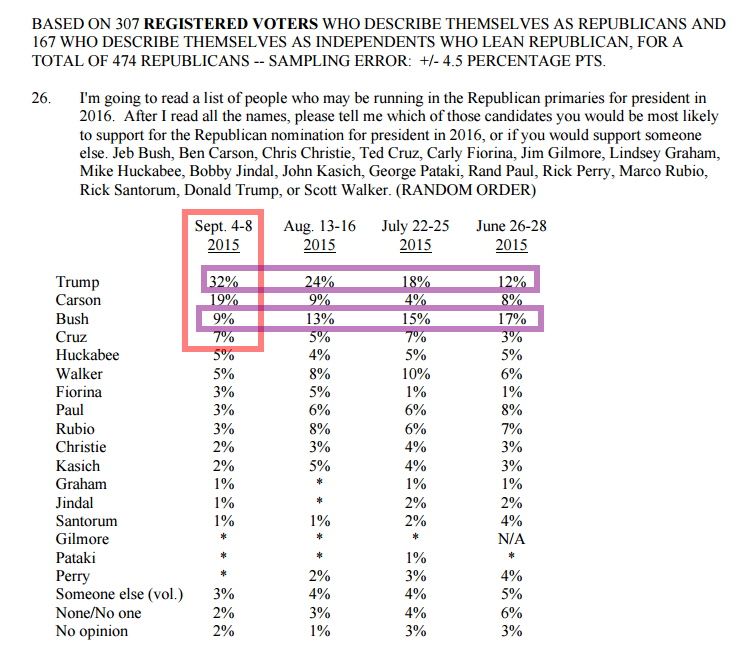 Notice how Bush's values have steadily decreased since June, whilst Trump's have steadily increased.
