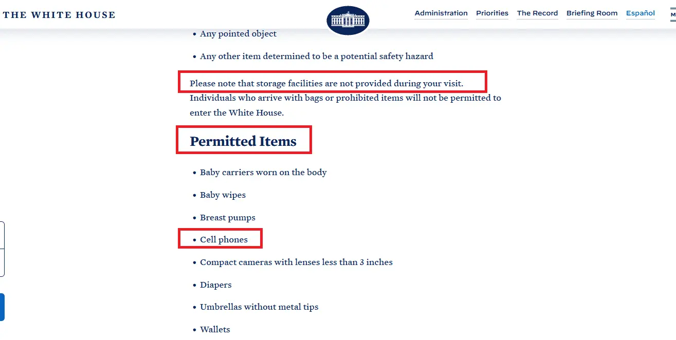 Well, if you go to the official White House tour page Visit The White House | The White House , it specifically says that cell phones are permitted and there are no public cubbies...