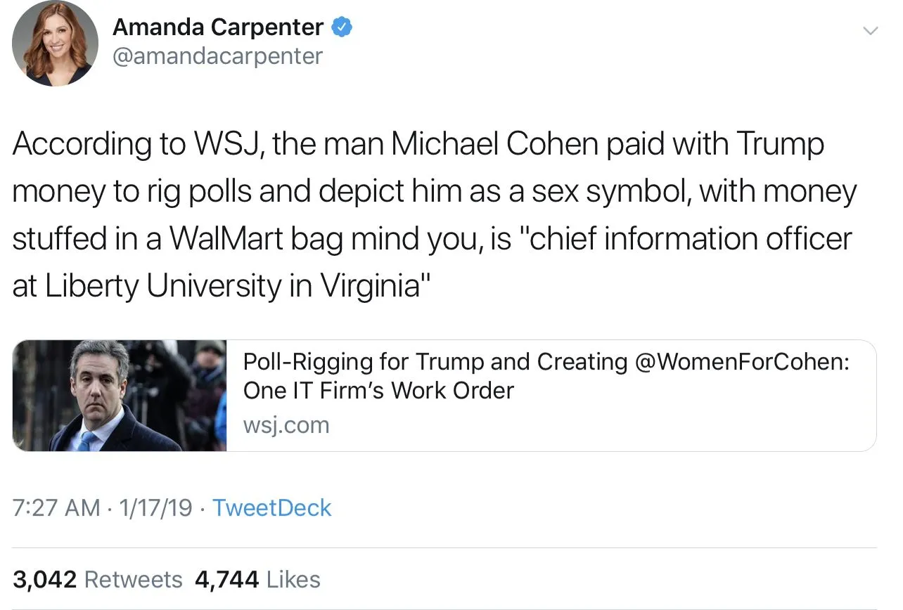 Michael Cohen hired Jerry Falwell's chief information officer to rig online polls in Comrade Trump's favor. Cohen then stiffed the operative out of the money he owed him.