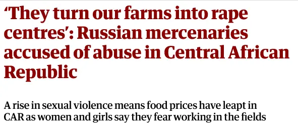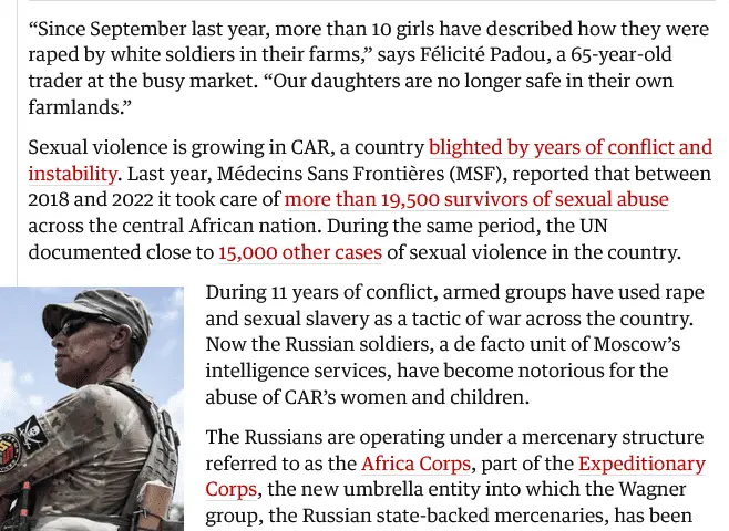 Most folks do not have enough media literacy to understand, TWO things, it has nothing to do with the Russia government, it has to do with a Russia Mercenary organization, and second, it only has to do with maybe a dozen sexual assaults (ten that they have documented,) caused by Russian nationals (nothing having to do with the Russian government,) out of 19,500 caused by the native population.