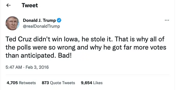 "Ted Cruz didn’t win Iowa, he illegally stole it. That is why all of the polls were so wrong any [sic] why he got more votes than anticipated. Bad!” Trump tweeted Wednesday morning. The tweet disappeared within minutes of posting and was replaced by with another that no longer included the word “illegally.”