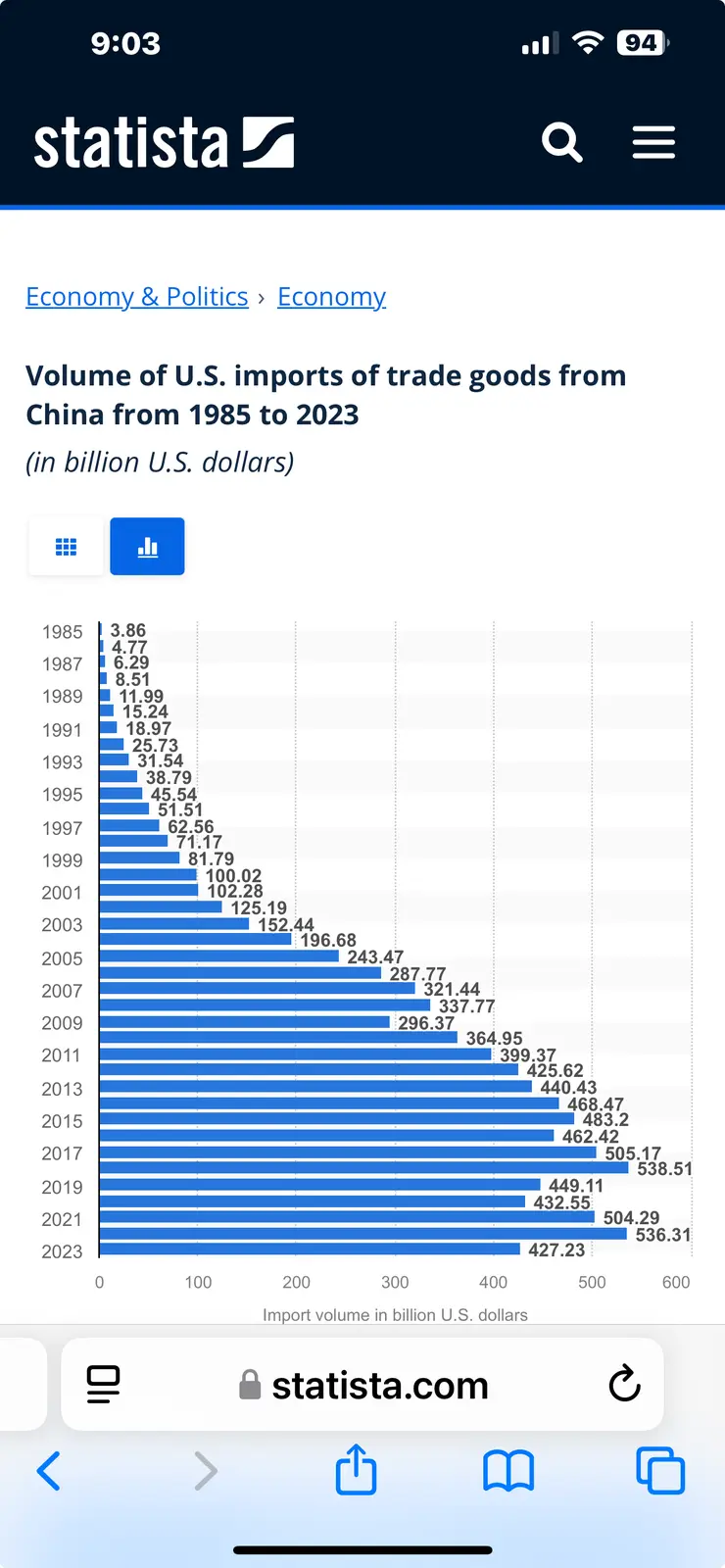 According to this chart imports from china rose steadily under bush, obama and biden but fell when trump was in officeThat would be a big mistake. And their " grip " on the US and the West is increasing. From 2022 through 2024 exports to the US increased by 176% , while exported to the world only increased by 136%. But that's still increasing not decreasing.. Since January that has increas d even more. We make ourselves the victims.