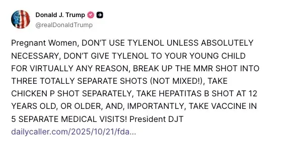 Trump did a copy-and-paste job of his own September post railing against Tylenol as well as the MMR, chickenpox and hepatitis B vaccines (which he misspelled as “HEPATITAS”), then added a link to a new report in the conservative Daily Caller that claimed the FDA ignored warnings about the use of the painkiller during pregnancy.
