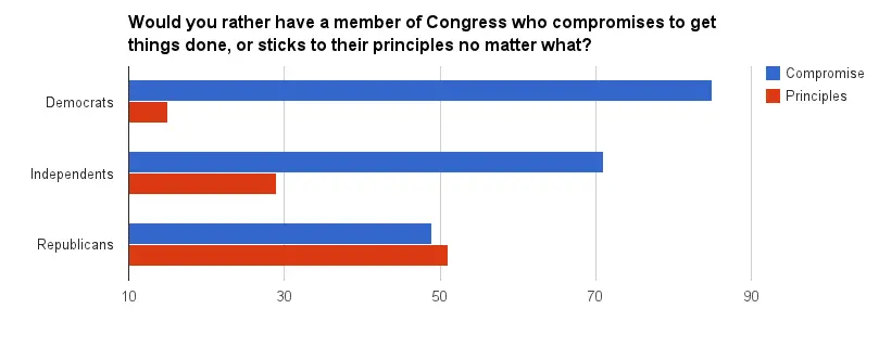 The question in a poll conducted by YouGov for The Economist, asked Americans whether they want a member of Congress who "compromises to get things done" or one who "sticks to their principles no matter what." Democrats and independents, by wide margins, chose compromise. But a slim majority of Republicans preferred standing on principle."