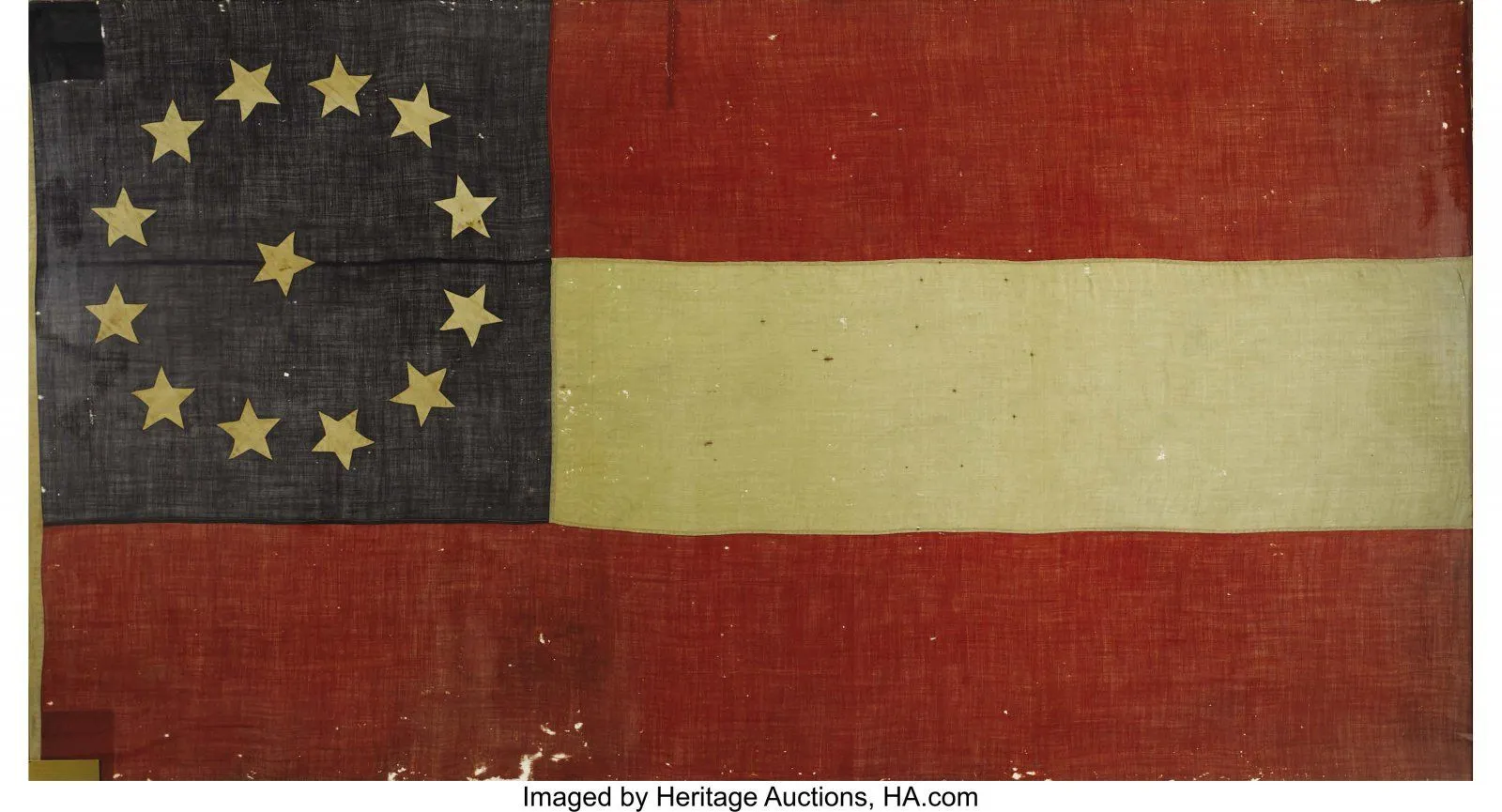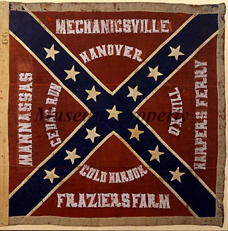 This is an example of a Confederate Battle Flag, or more specifically, an Army of Northern Virginia flag. Regiments from all over the Confederate states fought in the Army of Northern Virginia, commanded by General Robert E. Lee. The flags of these regiments were always the nearly all the same, square, with large white borders with 13 stars. The regiments painted battle honors on the flag, as seen on this example, flown by the 28th North Carolina Infantry regiment.