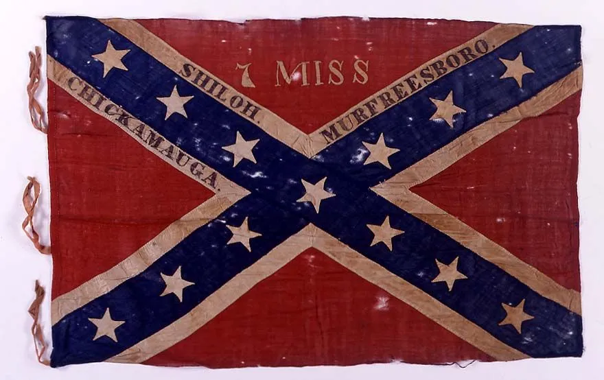 This is the closest example of what some people think is the Confederate Flag. Again, this is a battle flag, carried by regiments with the National flag. This particular one was flown by the 7th Mississippi Infantry regiment, Army of the Tennessee. The Army of the Tennessee was a rag tag bunch of misfits, and the flags showed it. Most followed the patterns of large white borders around the flag, and the blue cross. Battle Honors were typically painted along these borders.