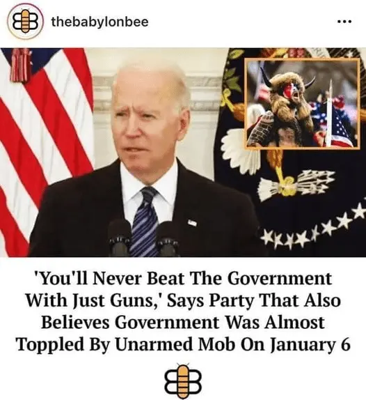 exactly what he said. He mocked the mere mention of such a thing. He smirkedly laughed at it. Hilarious.What is quite clear is that Joe Biden is saying that 1/6 was not an insurrection, and that there was no risk to the government from an UNARMED group of protestors.