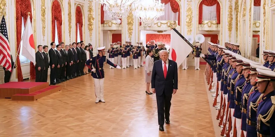 Donald Trump wandering aimlessly in Japan. The Prime Minister is behind him, he just left her behind. A soldier is trying to guide him. He doesn't even notice. He salutes the air.