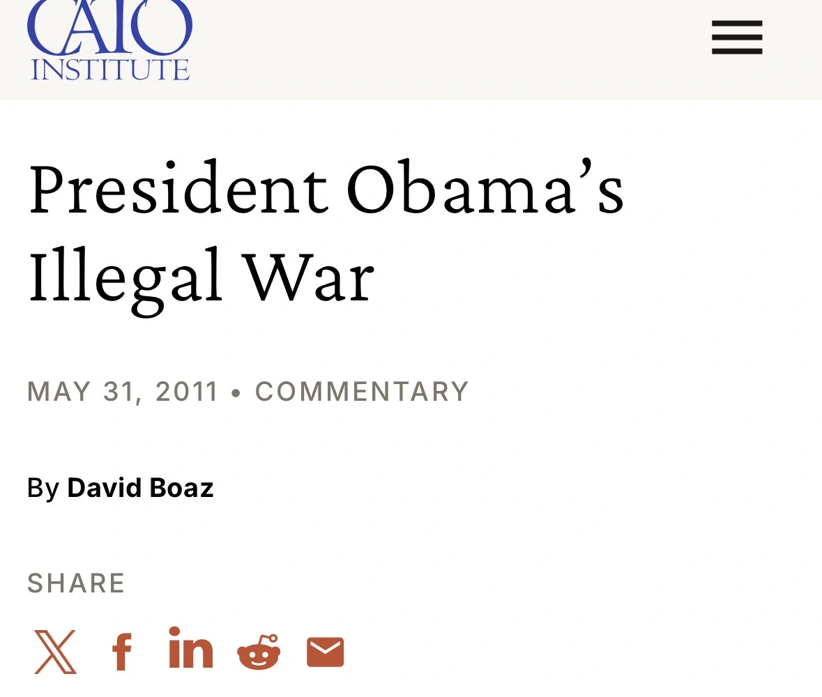 Whatever. The point is Obama launched a 6-month war in Libya without the approval of Congress."But the 2011 NATO intervention in Libya is a reminder that even Washington’s long-time allies like France and Britain can create the same danger. In their memoirs, Secretary of State Hillary Clinton and Secretary of Defense Robert M. Gates reveal (at times perhaps unintentionally) how those nations prodded the reluctant Obama administration into taking such a fateful step in Libya. Clinton herself was favorable to “humanitarian” military missions, while Gates was openly hostile, yet their accounts track closely, confirming how much of an impact allied lobbying had on American decision-making.