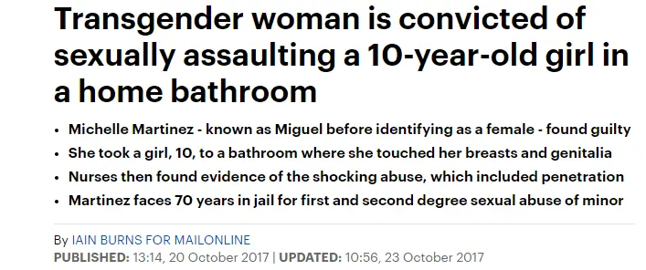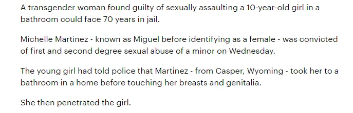 You have missed the ENTIRE point of this OP article, you have missed that this creature has DELIBERATELY USED the Transgender excuse to somehow convince a group of idiots who are probably more concerned with NOT offending anyone to release this child RAPIST back into the public.