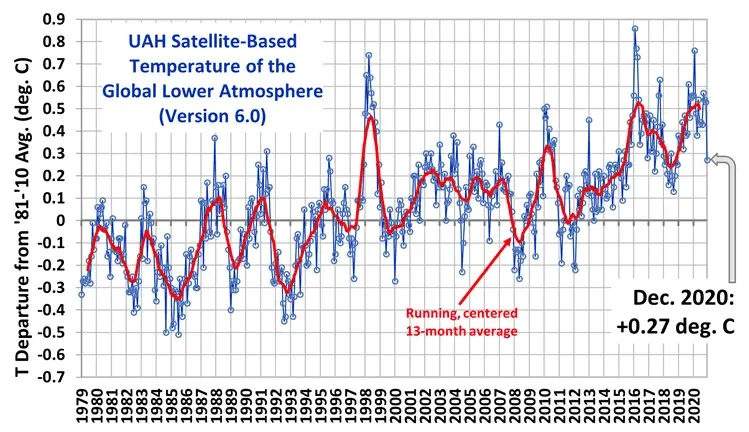 But a small regional change of the Eastern Pacific EASILY overwhelms it, that causes pronounced cooling down the road. It has already cooled from the previous 2016 high, when a weak La-Nina showed up, creating a huge .5C drop in a SINGLE year!