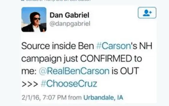 Notice the time stamp but more importantly, a source inside Carsons campaign? Yeah right. All out lie. BTW this Cruz plant pulled the Tweet to try and cover his tracks but its the internets and someone grabbed the screen shot![]()