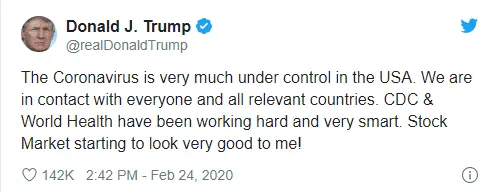 “We have it totally under control,” Trump said on CNBC. “It’s one person coming in from China, and we have it under control. It’s going to be just fine.”