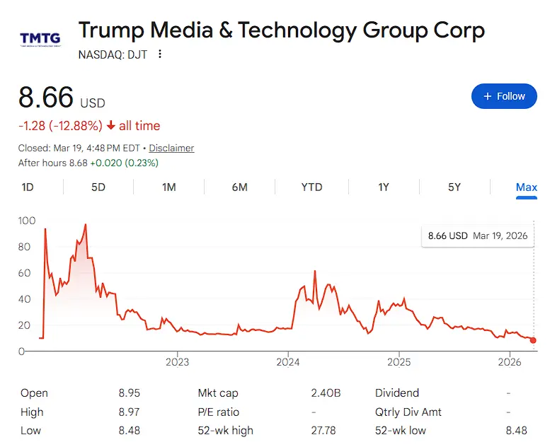 The company, which trades under the ticker DJT, burned through over $700 million dollars while bringing in just $3.7 million in revenue. The company merged with a nuclear fusion firm, bought a bunch of bitcoin, floated a spin-off of Truth Social. None of it has worked.