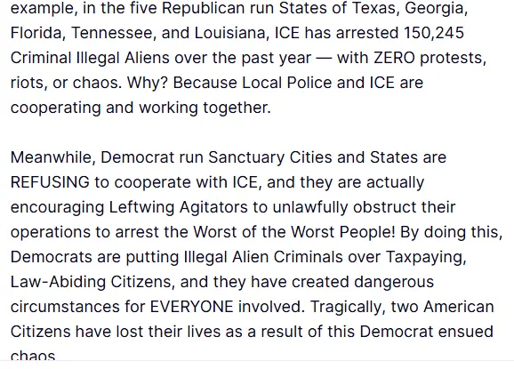 MAGAs do not have absolute power in CongressIf all of ICE is pulled from the state, everything ends, they don't have anything to 'protest' anymore, no more 'media' coverage, it pulls the rug out from under them. The Dumbo 'leadership' want the protests, they want the 'media' attention, they want the chaos, don't give it to them. Let them deal with the problem they are creating, it will come back to bite them eventually. They should lose all federal funding, any federal operations in the state should be moved out. If we had a party worth a damn, they would pass legislation against 'sanctuary' states/cities/local municipalities, where if they declared themselves as such and will not cooperate with federal law enforcement then they lose all federal funds. Do you ever hear anyone in the R party saying anything like that? People like you and I have no representation, or very little.