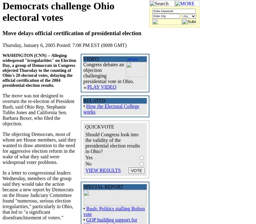 Are you saying they don't? What would you fix or would you just make it harder to vote? That does seem to be the GOP goal.Like Democrats want to fix the system now?Had you read it, they were not trying to overturn the election but rather fix the system. I wonder if they ever got any support from the GOP?Oops. CNN forgot to delete this from their 2005 archives.
