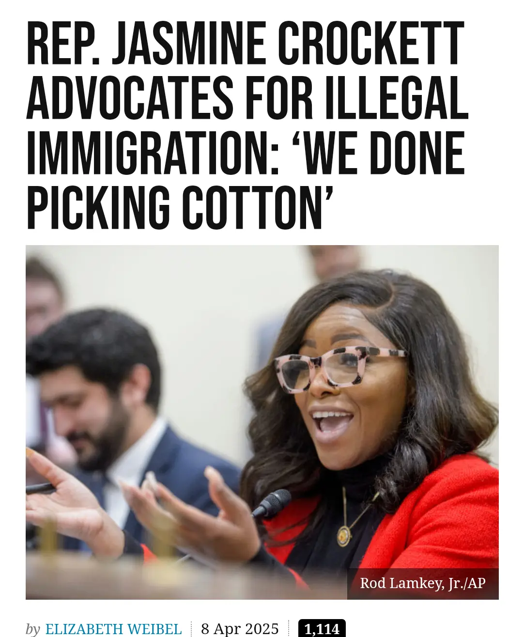 Rep. Jasmine Crockett (D-TX) advocated for illegal immigration in the U.S. and suggested black Americans were "done picking cotton."