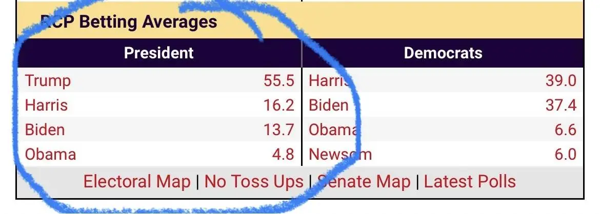 I noticed that Biden has pulled back out in front of Kamala Harris again. Recently she was ahead of Biden.As the saying goes, money talks and bullshit walks. The betting money says Trump is around 10 times more likely to be President than Sleepy Joe.