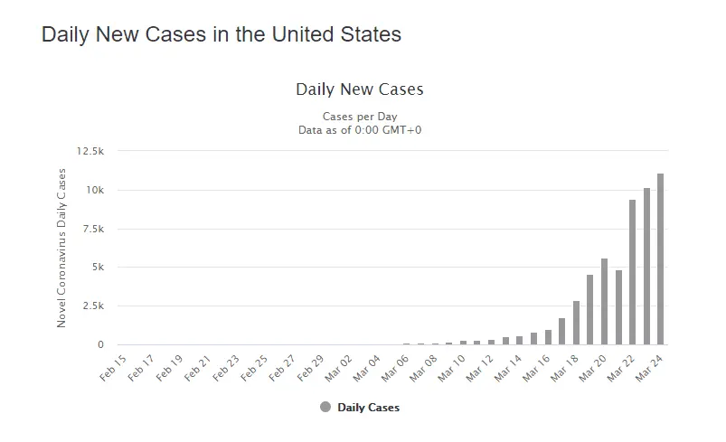America is now predicted to become the new epicentre for COVID-19. China was the first epicentre, then my Continent was the second epicentre and now it's America's turn you are now registering nearly twice as many New Cases as Italy is, you have nearly 10.000 New Cases already today nearly twice as many as Italy's New Cases.