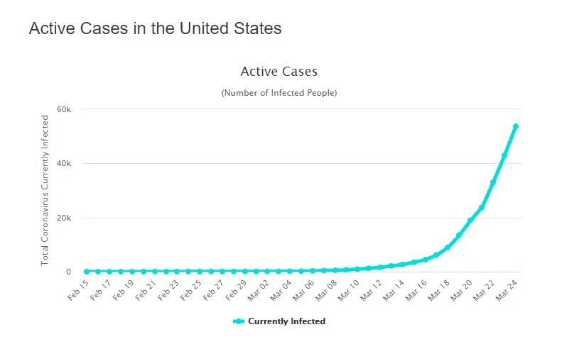 The numbers will continue to change, but I think it's clear we are on the up side of the curve with no idea where the peak is. President Trump said he will see where we are at the end of the 15 day social distancing program before making a decision on what to do next. I'm sure they are considering lots of options, but I think if the numbers continue to rise sharply we should consider quarantining high risk people and allowing low risk people to go about their business until the virus plays out before an extended shut down of the whole nation.