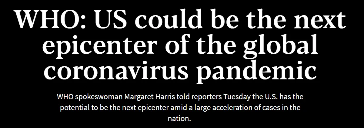 But in the context of comparing the US to Europe, whereas in this thread the assertion has been continually made that the US will suffer the same disaster as Italy and no experts in CDC or WHO has made that claim.When she said the US could become the epicenter, she was speaking of the US.In response to a question, the spokesperson for WHO said it was not happening but that it was possible it could happen, but she was speaking of Europe, not of Italy alone