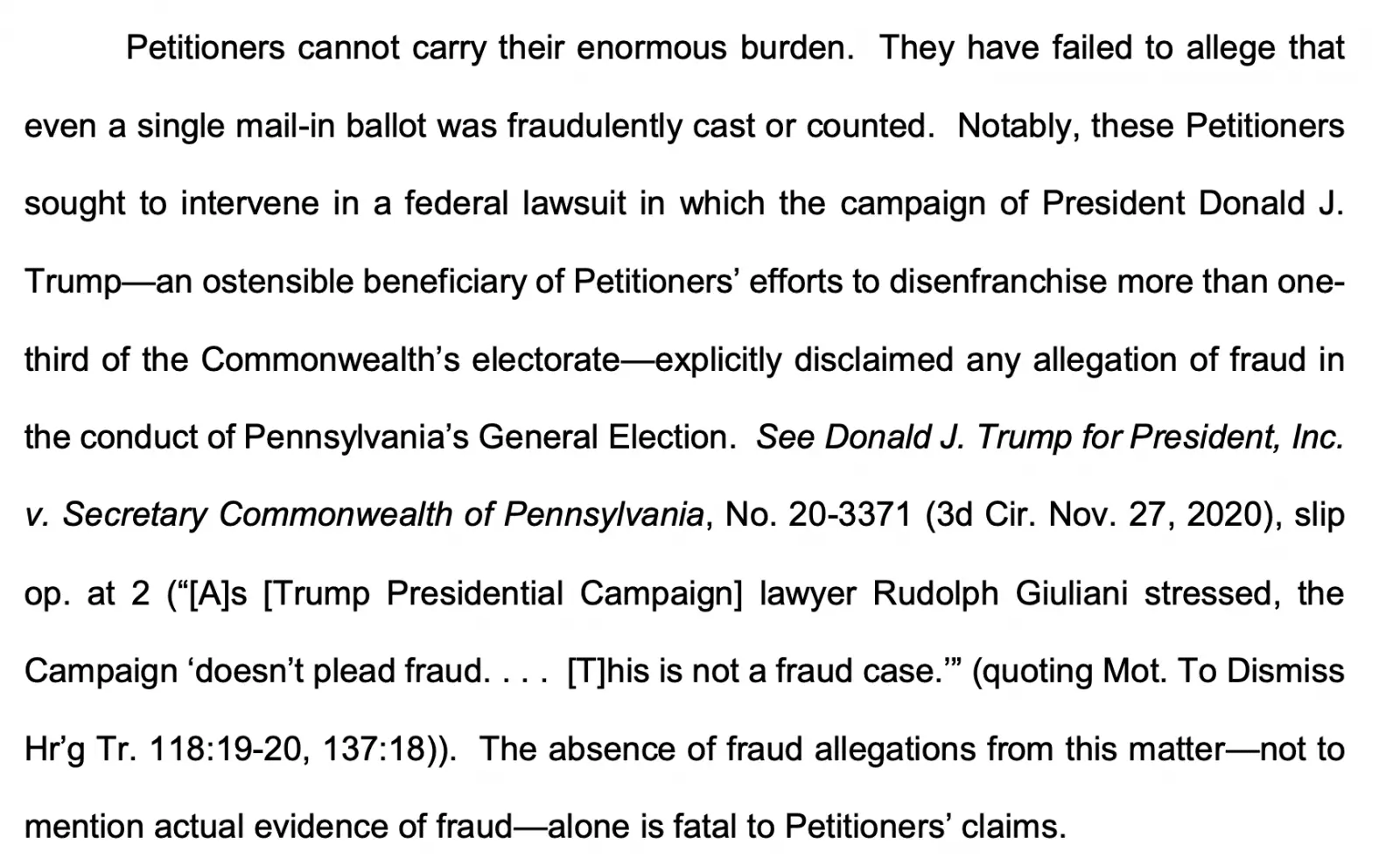 The problem is that these guys waited until two days before elections were certified to file a lawsuit even though the law was passed over a year ago. It's a bullshit move to wait for millions of people to vote by mail and then ask the courts to throw all those out because you didn't get off your ass to file a lawsuit before that happened. The PA Supreme Court acknowledged that this was a bullshit move.