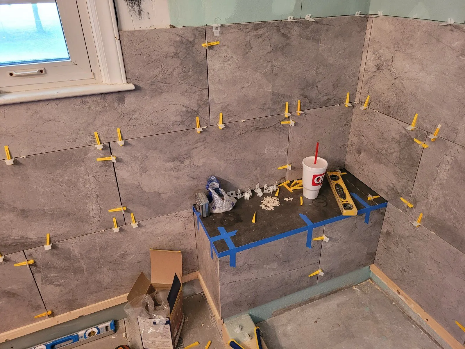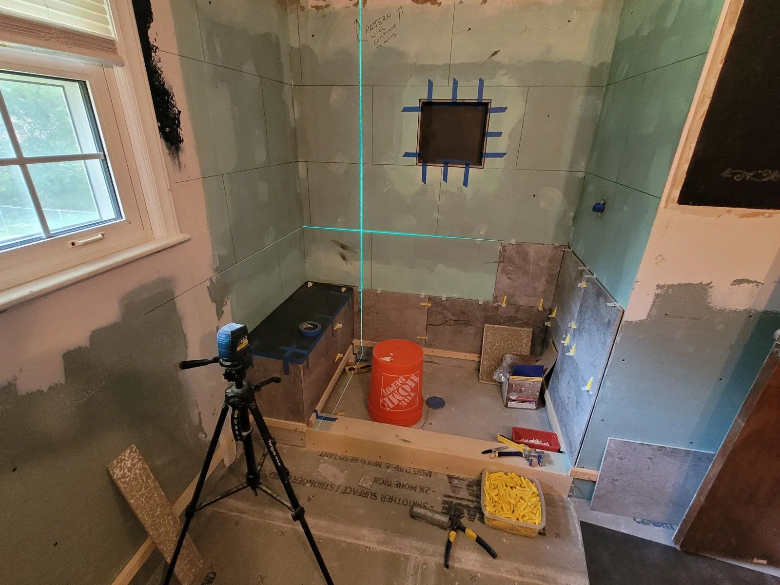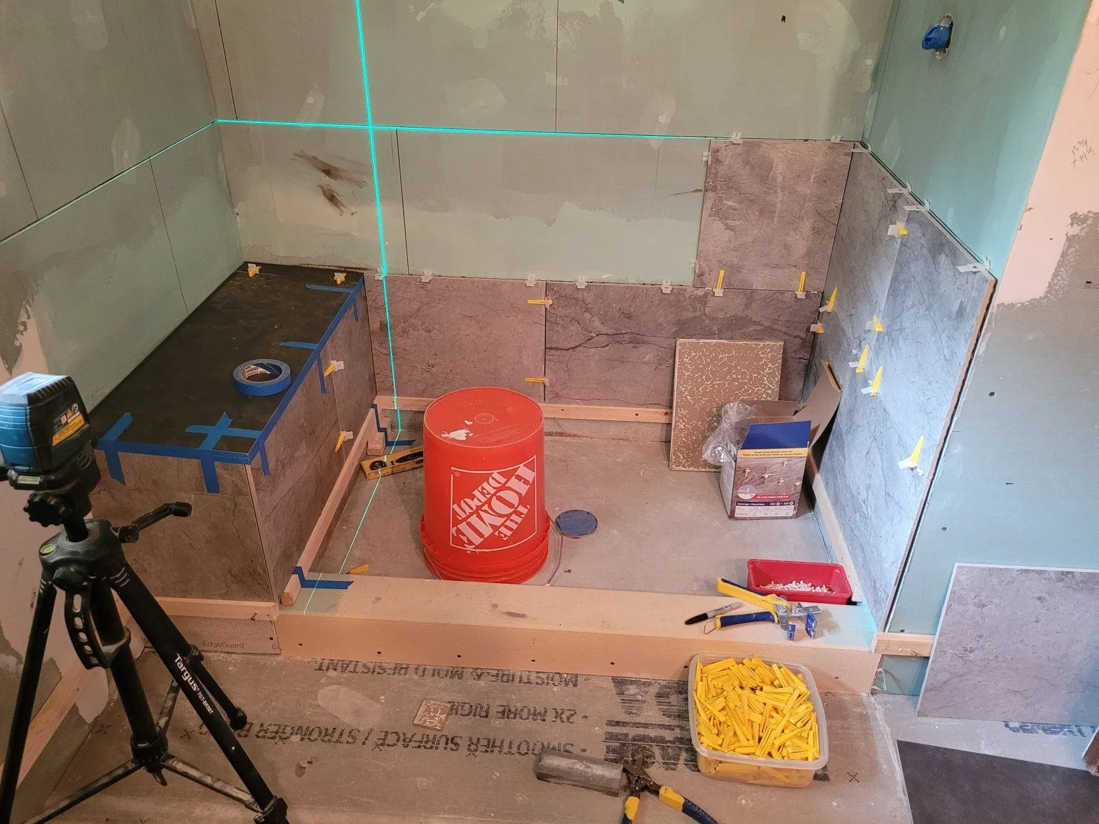 And the preslope has to go before the wall board because the liner has to go over it and behind the Concrete board. My showers have 2 layers of mud.