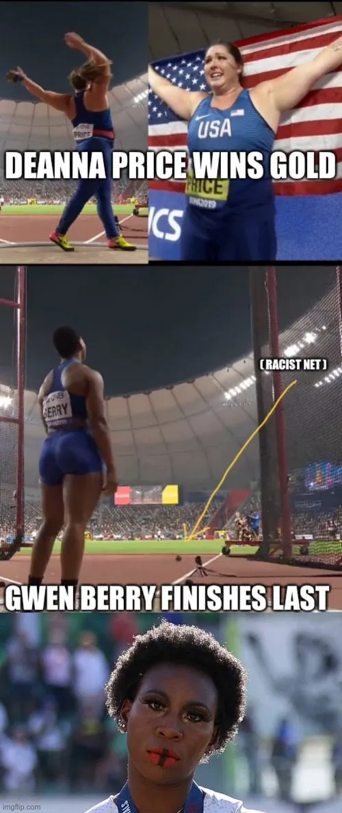 Gwen Berry, representing “the oppressed”, throws three hammers straight into the net. Literally a zero score.
