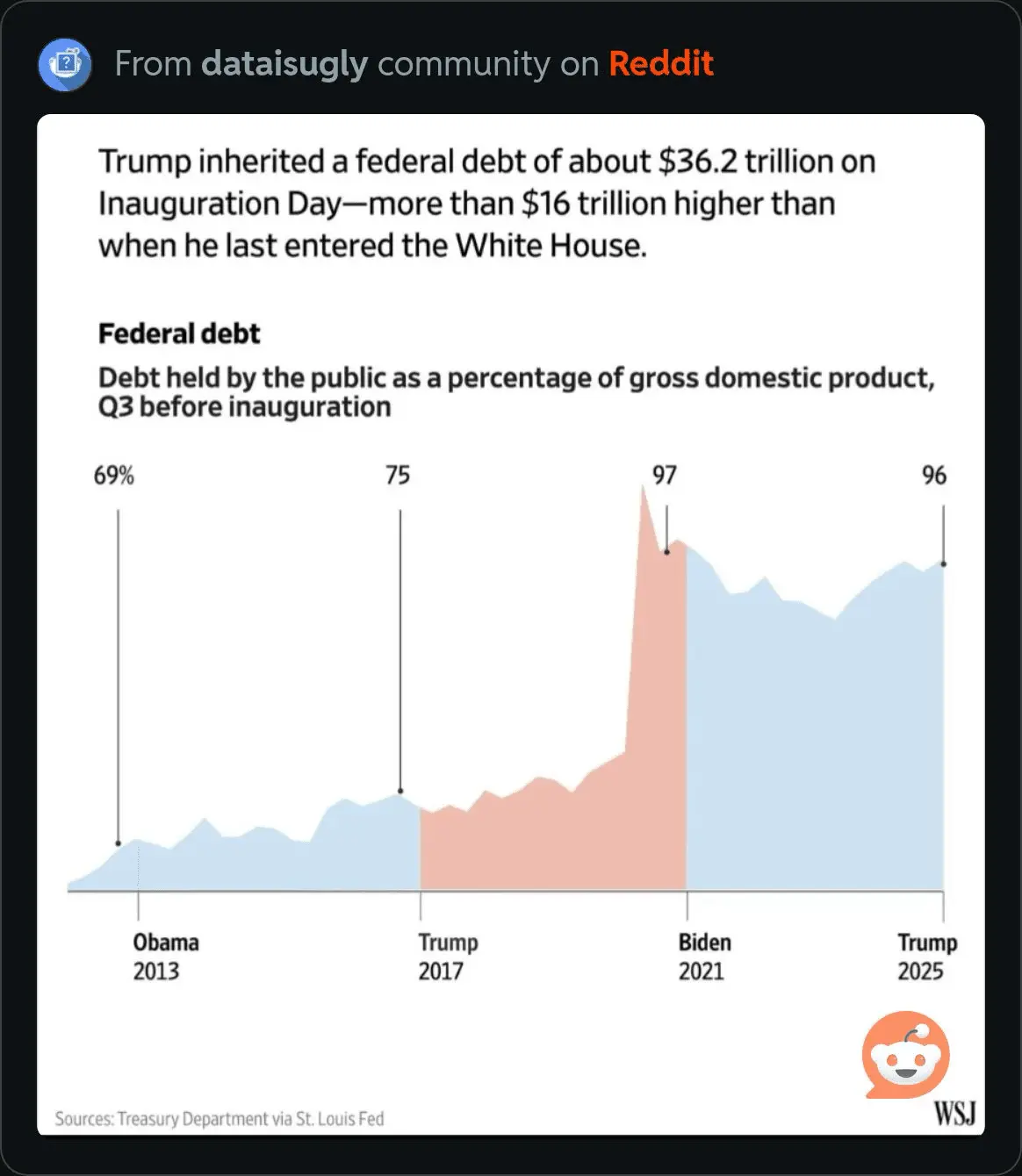 Debt as a percent of GDP is far more relevant. The chart shows how it EXPLODED under Trump and remained stable under Biden.Fact: BIDEN ADDED MORE TO THE DEBT THAN ANY OTHER POTUS IN 4 YEARS