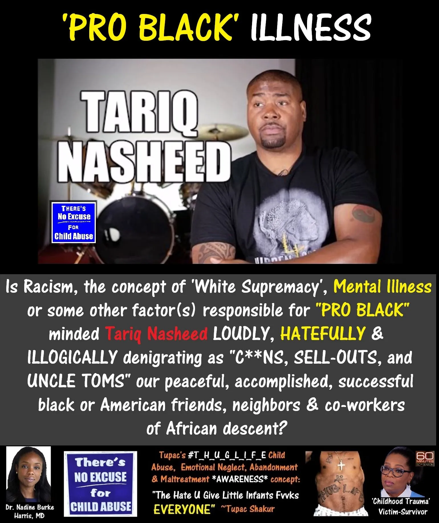 ...Tariq spends quite a bit of time preaching his 'White Privilege & Supremacy' gospel or mantra to a mostly PRO BLACK minded audience choosing to ignore America's potentially life scarring SYSTEMIC & GENERATIONAL Culture of Black or African American Child Abuse, Emotional Neglect and Maltreatment that evolved from America's multi-generational, ignorant, once legal Culture of Racism!