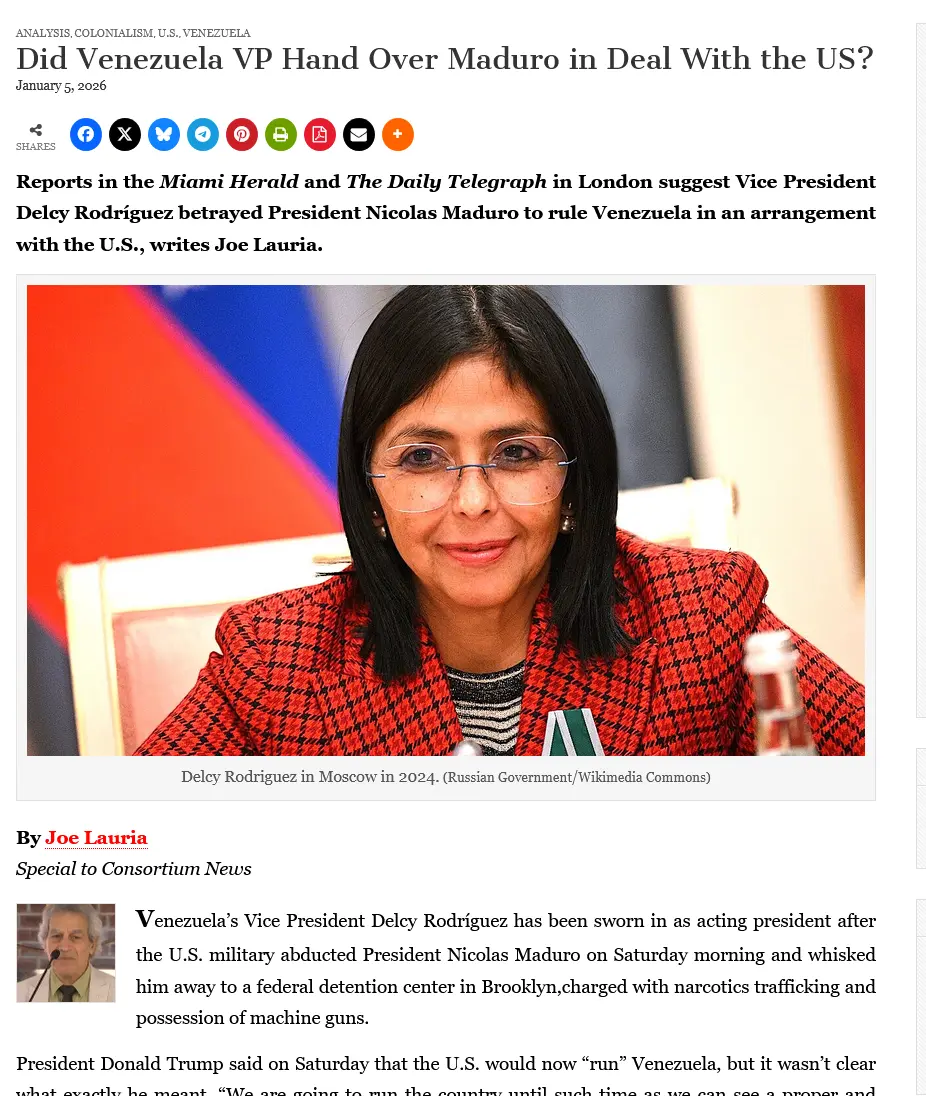Reports in the Miami Herald and The Daily Telegraph in London suggest Vice President Delcy RodrÃguez betrayed President Nicolas Maduro to rule Venezuela in an arrangement with the U.S., writes Joe Lauria. By Joe Lauria Special to Consortium News Venezuela's Vice President Delcy RodrÃgueconsortiumnews.com