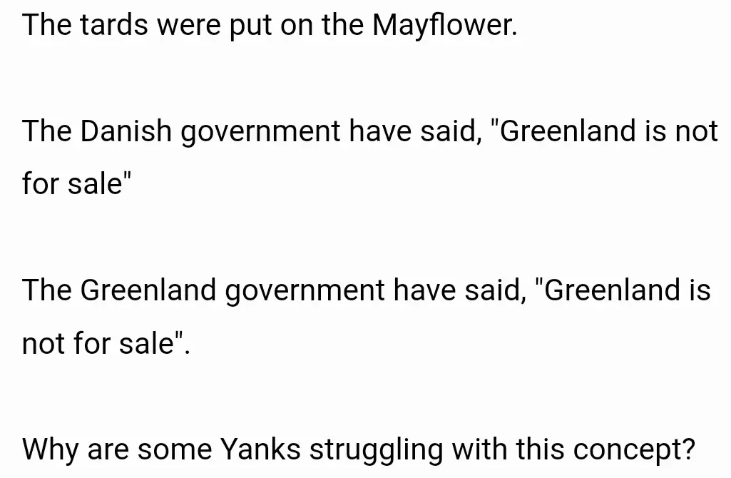 The TOPIC is the mentioned possible sale of Greenland. Try to focus, ape-boi.