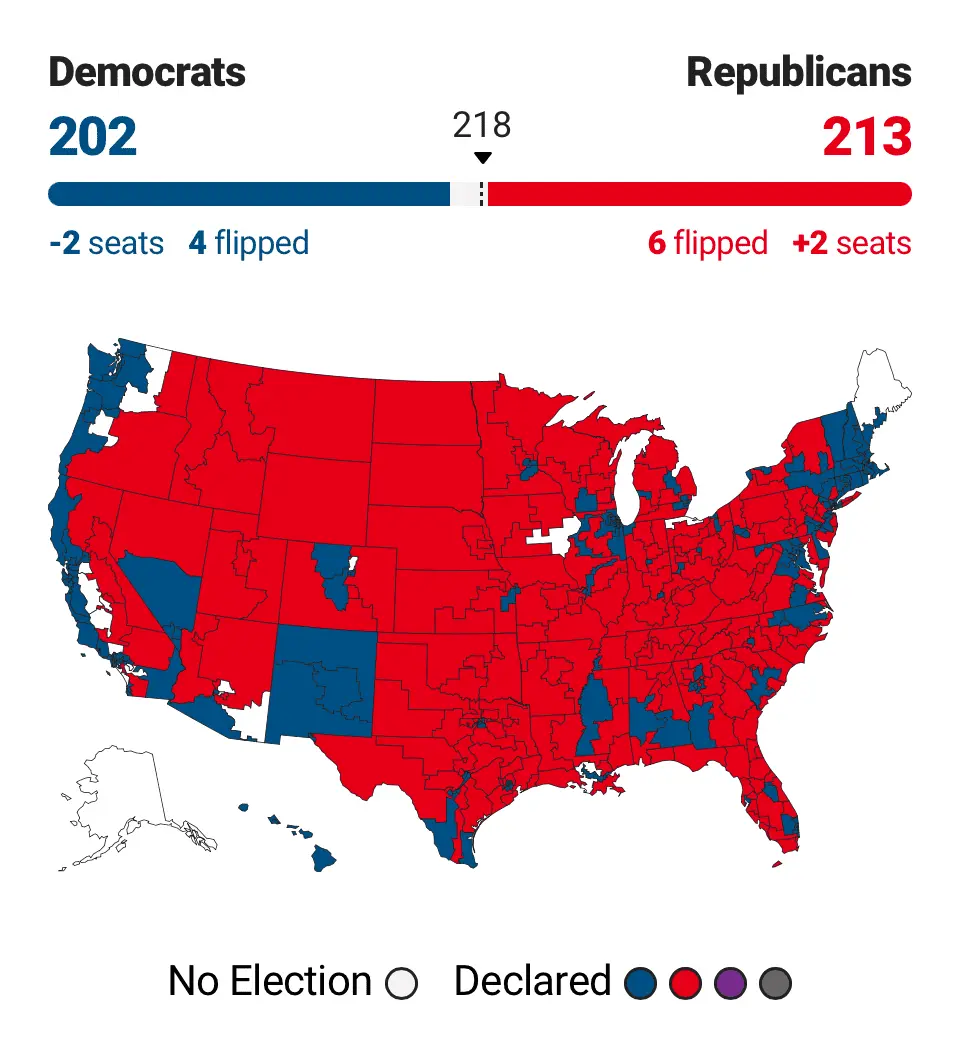 To win the House, the Democrats need to take six of the outstanding ten seats. Alaska has one and is dependably Republican, most of the areas of California still outstanding are the Republican areas, NOT the cities and coastal areas which are dependably Democratic. In Arizona it's the rural south-east corner and Phoenix. Rural Arizona tends to be solidly conservative. Maricopa could go either way. There are only three seats not allocated yet, the Democrats would have to win all three to have a chance which is unlikely at this point. AZ 1 is reliably conservative; I travel through there and there are endless Trump signs and flags to be seen and no Harris ones. The Republican is five points ahead there. AZ 6 is a toss-up with the republican having a fifty some thousand vote advantage now with 77% counted. it's pretty unlikely the Democrat will take AZ 1which will give the Democrats two seats at best. In California it looks like the best the Democrats can do is three seats bringing them up short by ONE SEAT to control the house./——/ It’s too close to call. As of this morning on Fox.