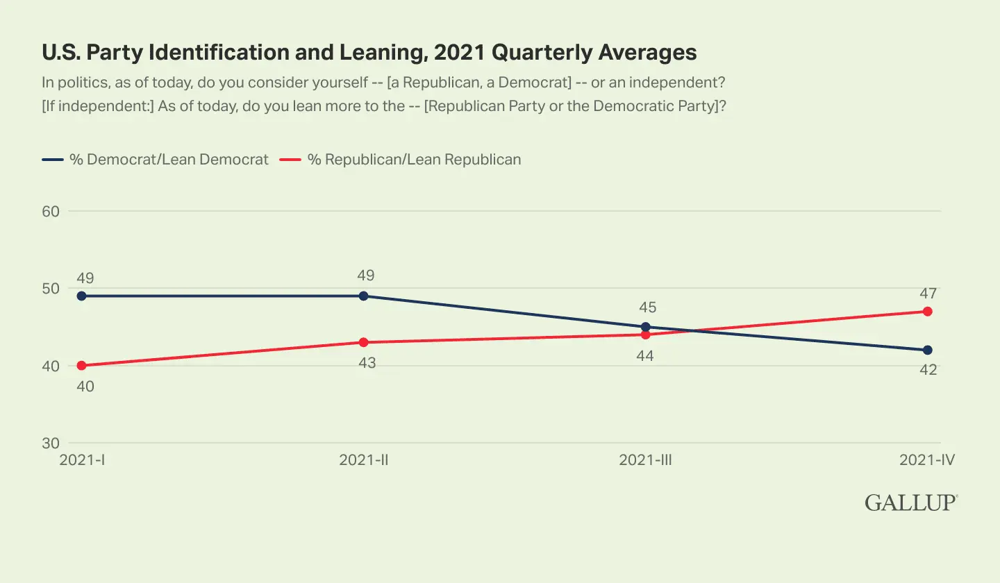 Although the U.S. political party affiliation average for 2021 was similar to prior years, the country shifted from a nine-point Democratic preference early in the year to a five-point Republican advantage near the end.news.gallup.com