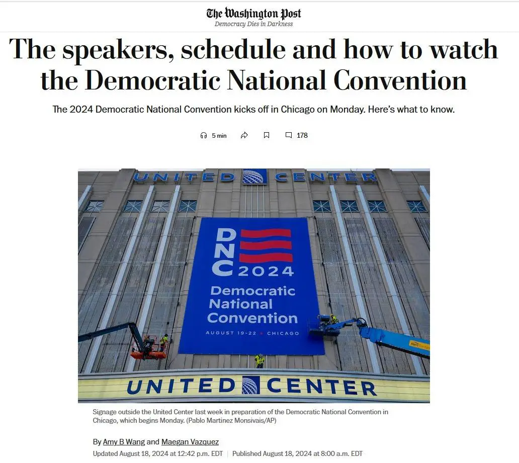 Reporting that this week, "tens of thousands of people are expected to travel to Chicago for the 2024 Democratic National Convention" -- that's a lot of people. I wonder what tv and media viewership will pull in: cable, network news, local news, newspapers, radio, websites..?