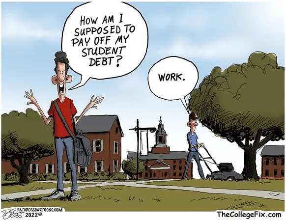 /——-/ No it didn’t. The point was if you have debt, your resolution is to work, earn money and pay it off. The problem with one panel cartoons is that you make a generalization to making a point knowing full well some readers will over think and come up with ridiculous scenarios.Sorry, but did that meme mention the degree the student recieved?