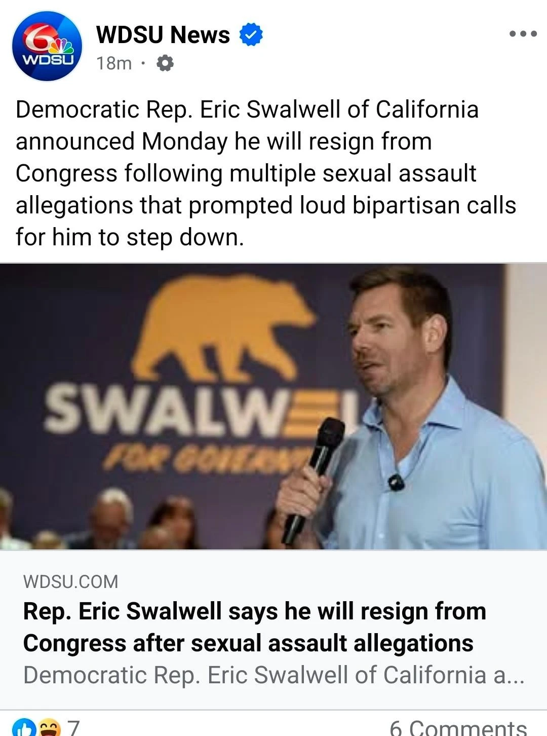 I hope, if he broke any laws, this doesn’t absolve him and he is fully prosecuted.... Like Bondi...perjury needs to be prosecuted regardless of whether they still have their job or not.Rep. Eric Swalwell (D-Calif.) announced on Monday he is resigning from Congress, a day after sexual assault and misconduct allegations forced him to withdraw from the California governor race.