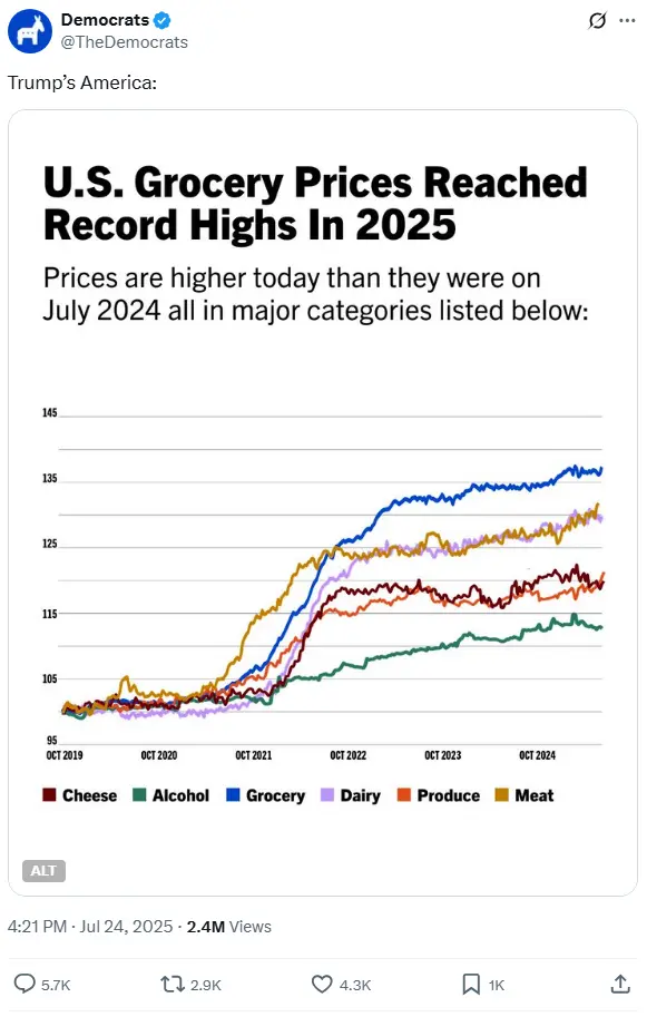 The Democrats official X account posted a chart featuring US grocery inflation. The intent was to show the public that prices had reached record highs in 2025