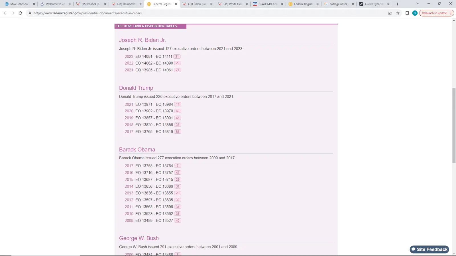 Presidential Document, and of presidential document type Executive Order","total_pages":1,"results":[{"citation":"88 FR 83809","document_number":"2023-26569","end_page":83812,"html_url":"Federal Register :: Request Access","pdf_url":"https://www.govinfo.gov/content/pkg/FR-2023-12-01/pdf/2023-26569.pdf","type":"Presidential Document","subtype":"Executive Order","publication_date":"2023-12-01","signing_date":"2023-11-27","start_page":83809,"title":"Interagency Security Committee","disposition_notes":null,"executive_order_number":"14111","full_text_xml_url":"https://www.federalregister.gov/documents/full_text/xml/2023/12/01/2023-26569.xml","body_html_url":"https://www.federalregister.gov/documents/full_text/html/2023/12/01/2023-26569.html","json_url":"https://www.federalregister.gov/api/v1/documents/2023-26569?publication_date=2023-12-01"},{"citation":"88 FR 75191","document_number":"2023-24283","end_page":75226,"html_url":"Federal Register :: Request Access","pdf_url":"https://www.govinfo.gov/content/pkg/FR-2023-11-01/pdf/2023-24283.pdf","type":"Presidential Document","subtype":"Executive Order","publication_date":"2023-11-