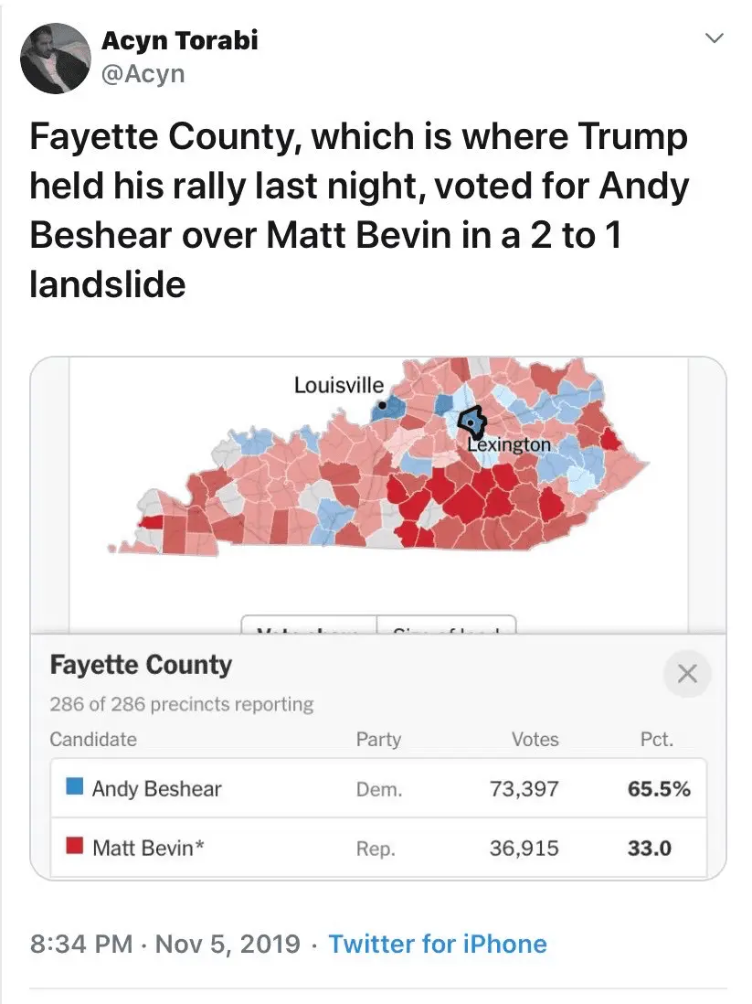 That shows they have some sense...voting the person rather than the brand. I find that smart...Im not surprised that bevin lost. Ky's local, state politics dont follow any type of logic. They'll vote for a R senator and a dem governor on the same day.