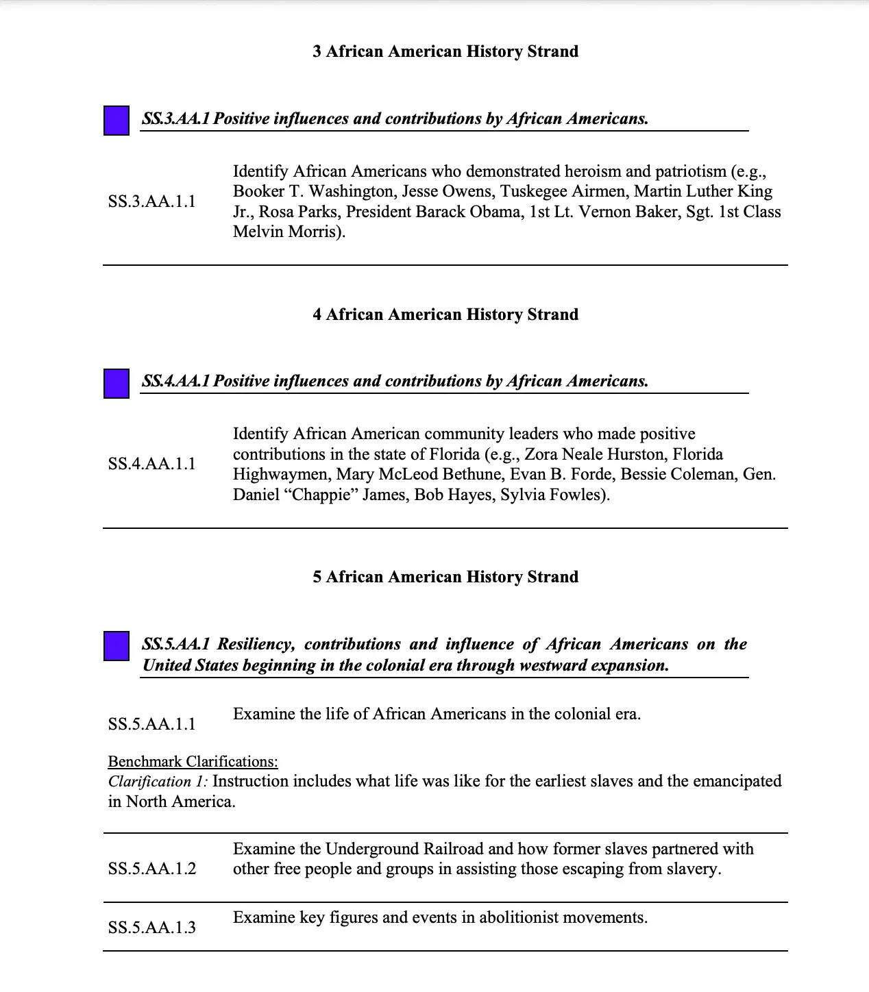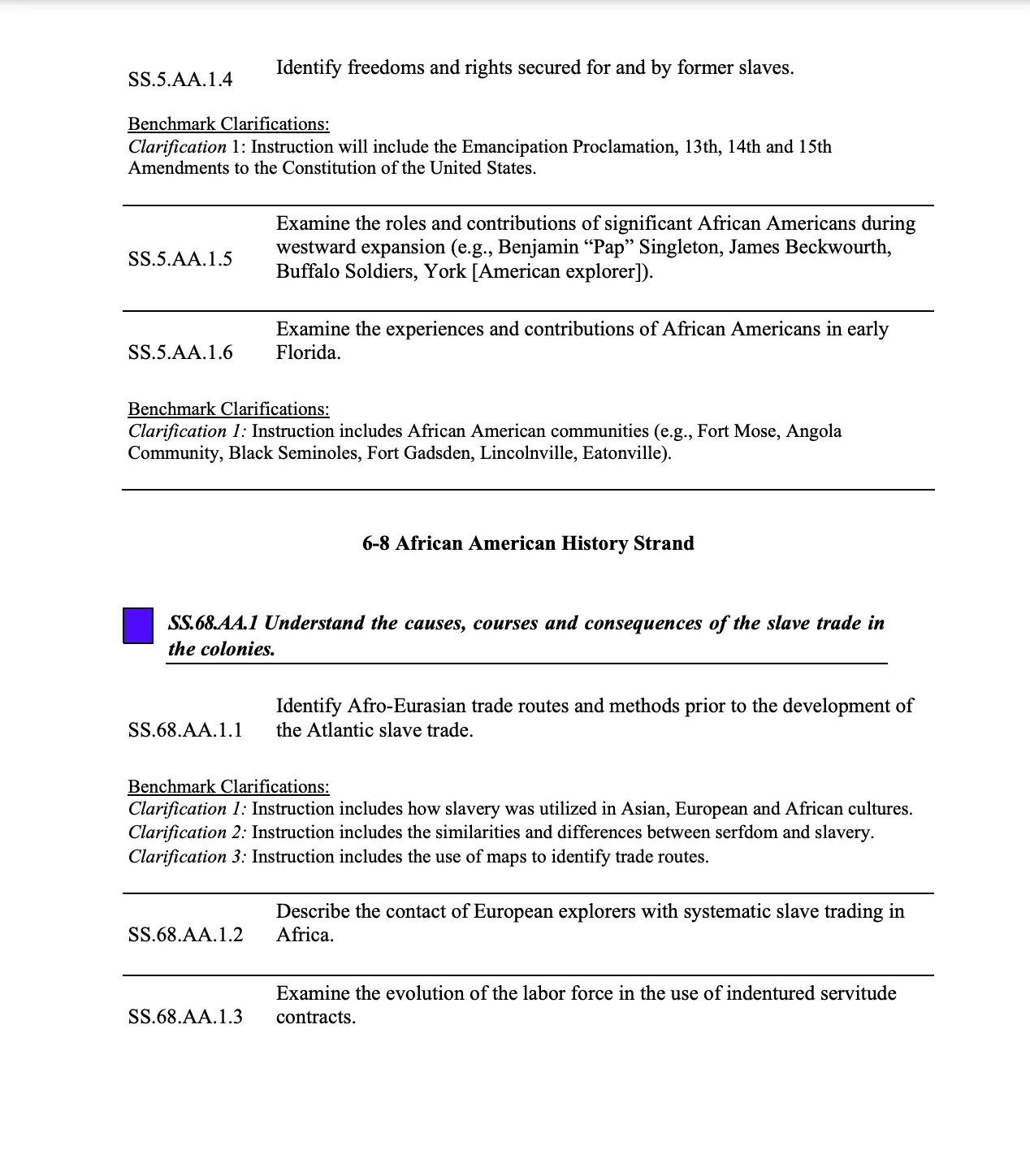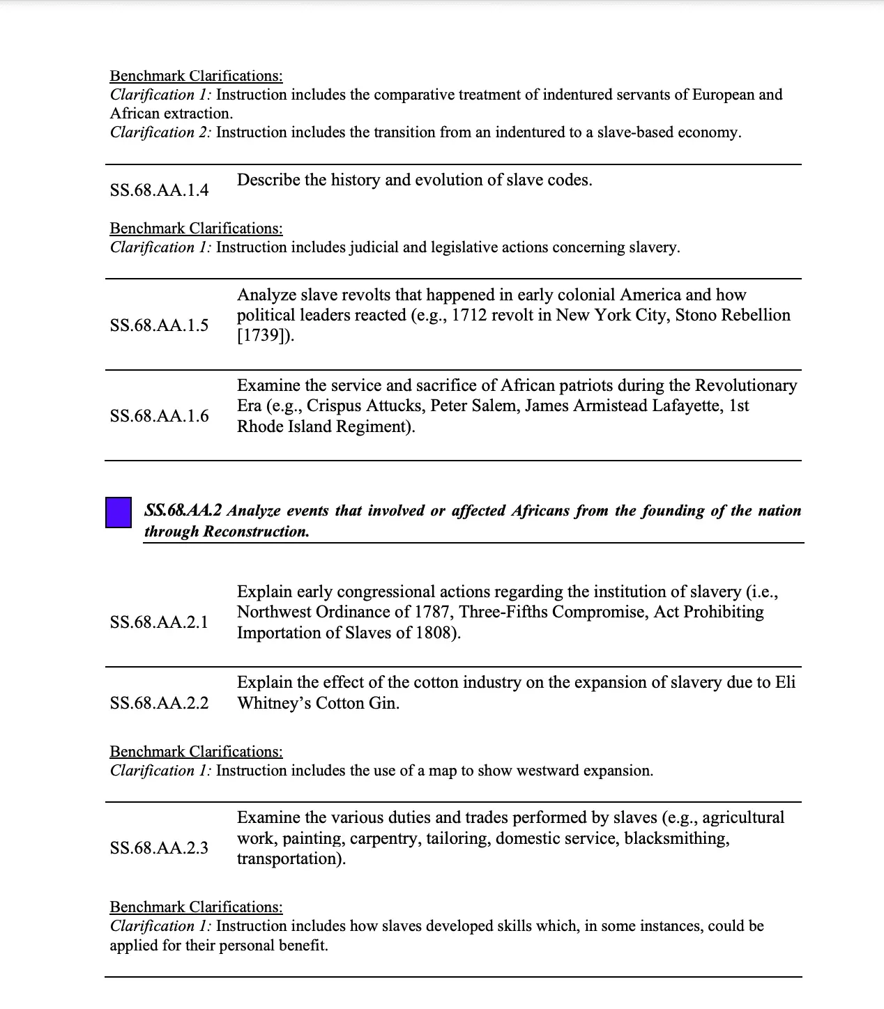 The Curriculum also includes sections on African-American contributions to our country, and Florida in particular, via their patriotism, art, discoveries, etc.. It highlights the Abolition movement. Nowhere does it say slavery was a good thing.