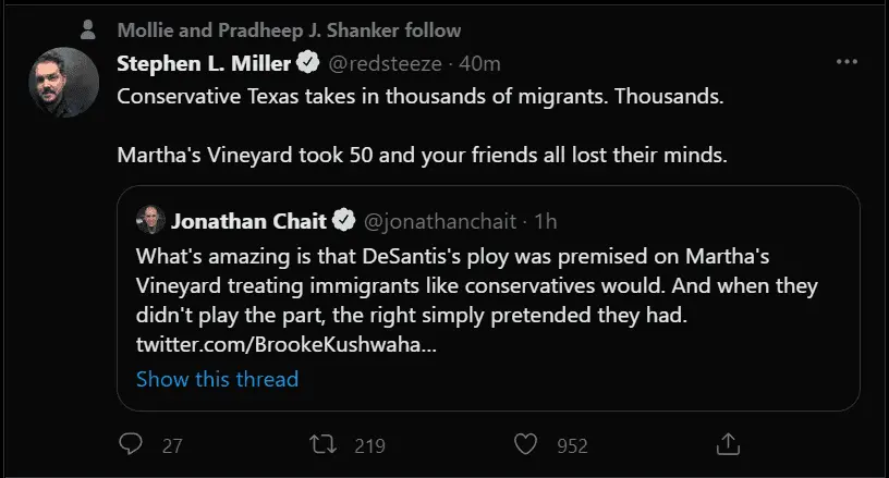 i thought these people didn't existMartha's Vineyard got sent 50 migrants, 1% of what Texas sees some days....